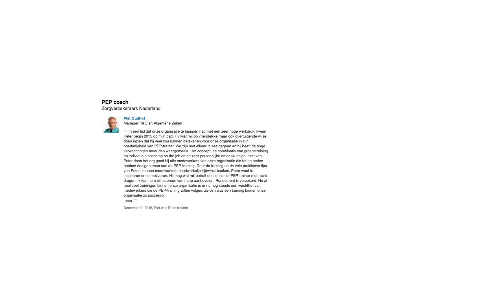 Al bijna 12 jaar verzorg ik met veel plezier PEP – trainingen (PEP staat voor Personal Efficiency Program).